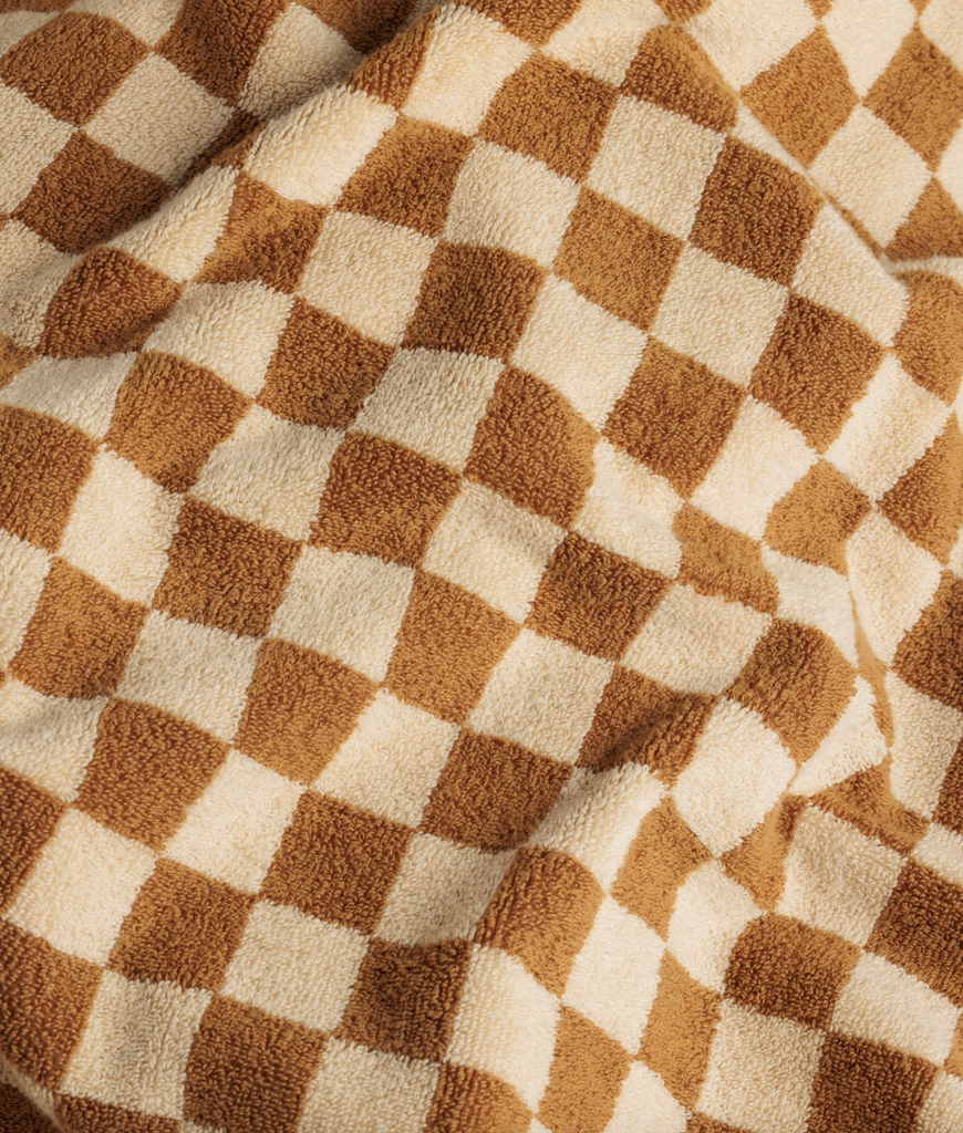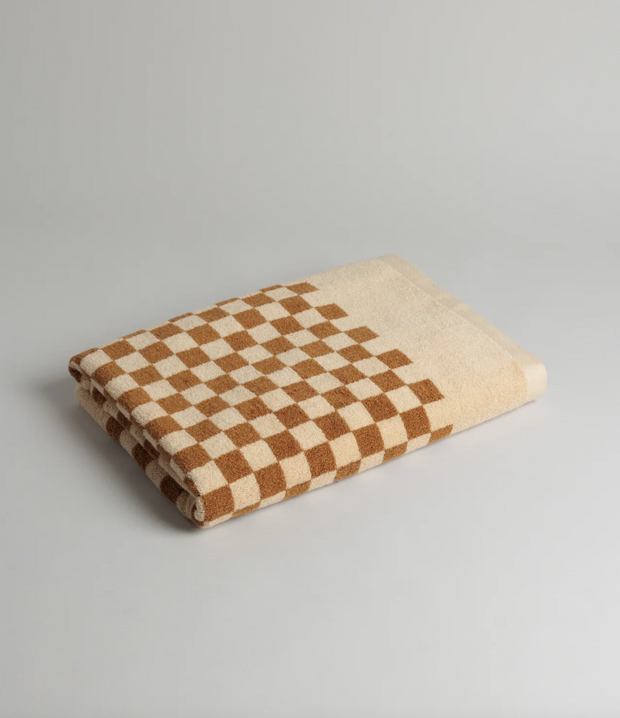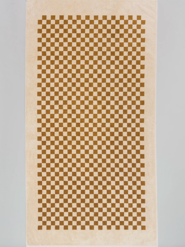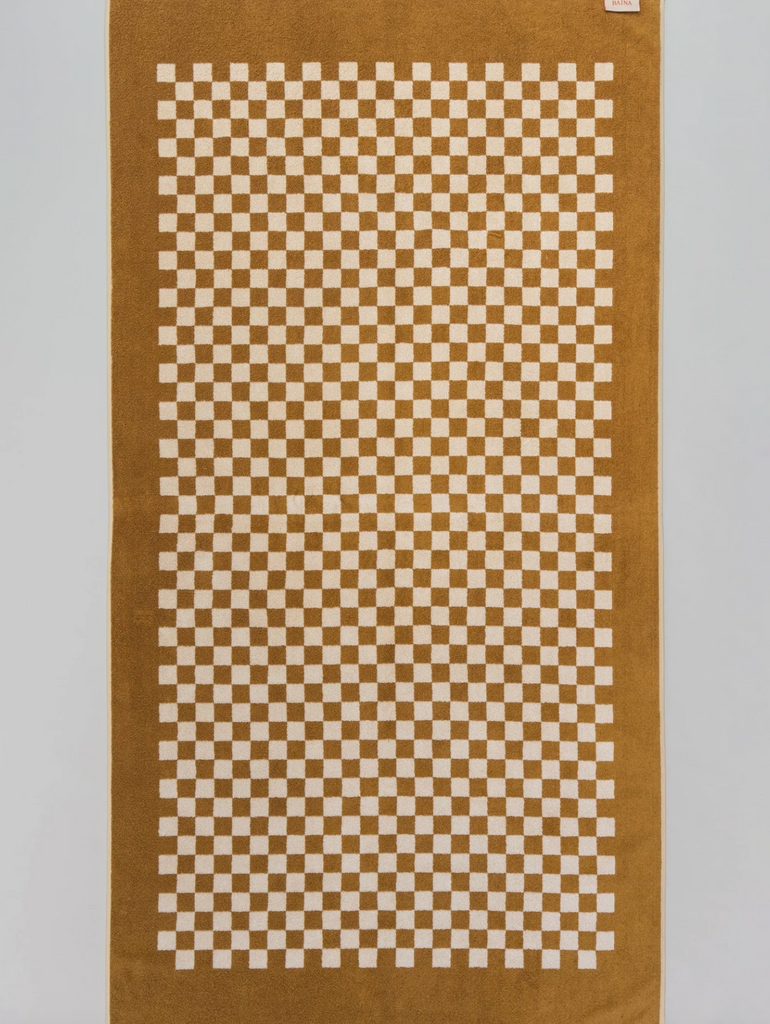 100% Organic Cotton pool towel or beach towel. This playful towel in checkerboard print is synonymous with the BAINA brand features a reversible colour-way. Ceckerboard makes a subtle statement in any bathroom or on any beach. 90 x 170 cm 100% Organic Cotton