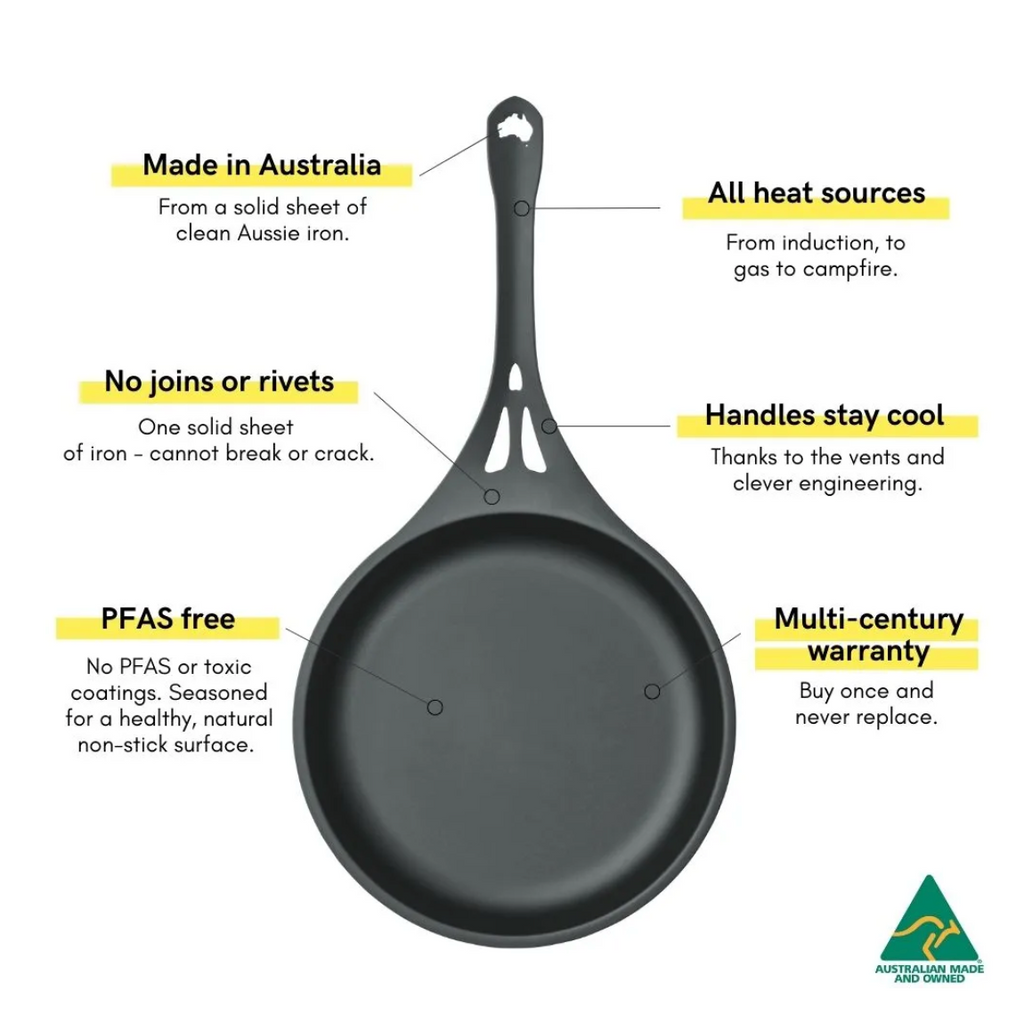 Material: Shot-peened 3mm thick Australian wrought iron for even heating.