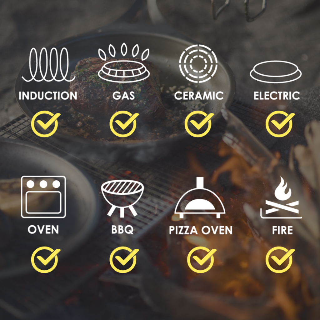 - Suitable for Induction, stove tops, BBQ’s, campfires + all (non-microwave) ovens, even charcoal and pizza ovens.