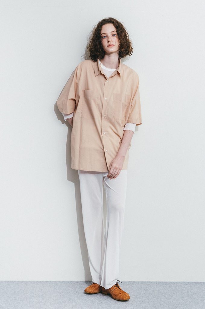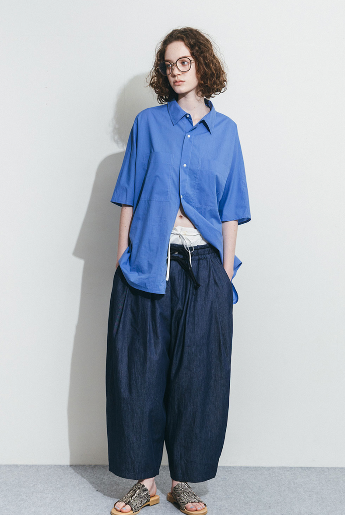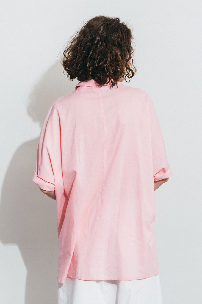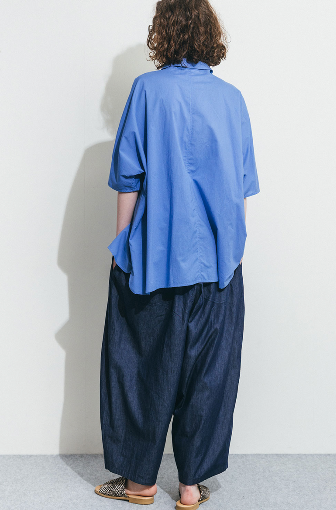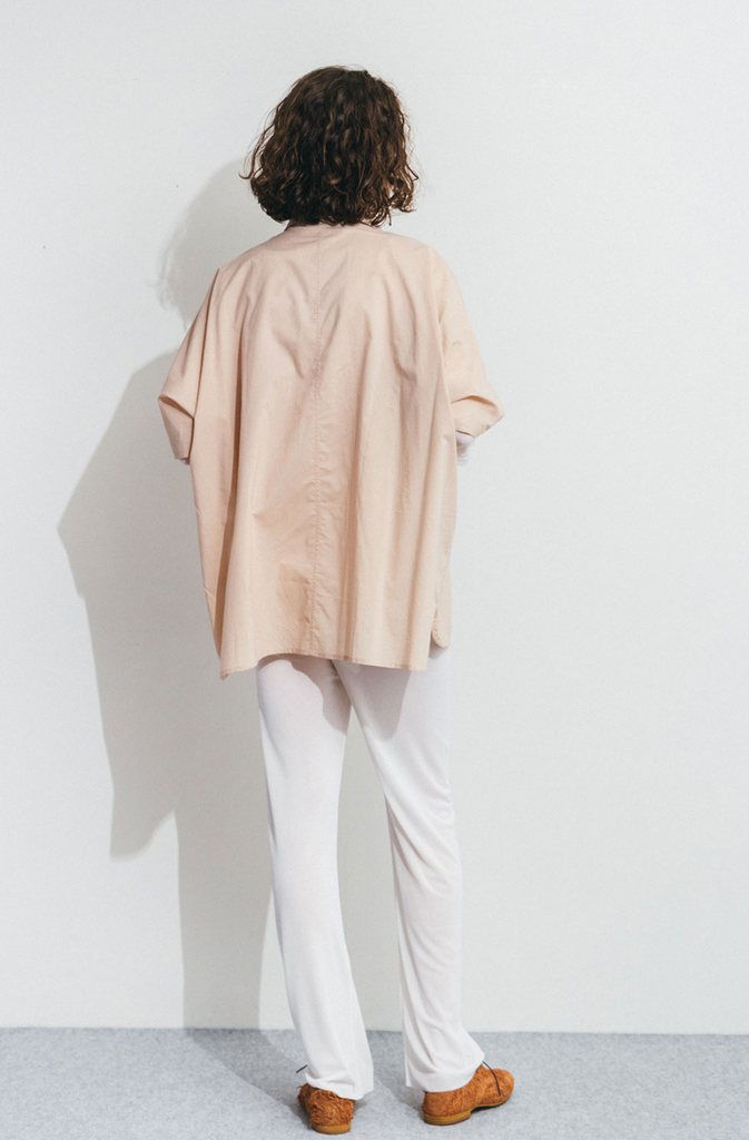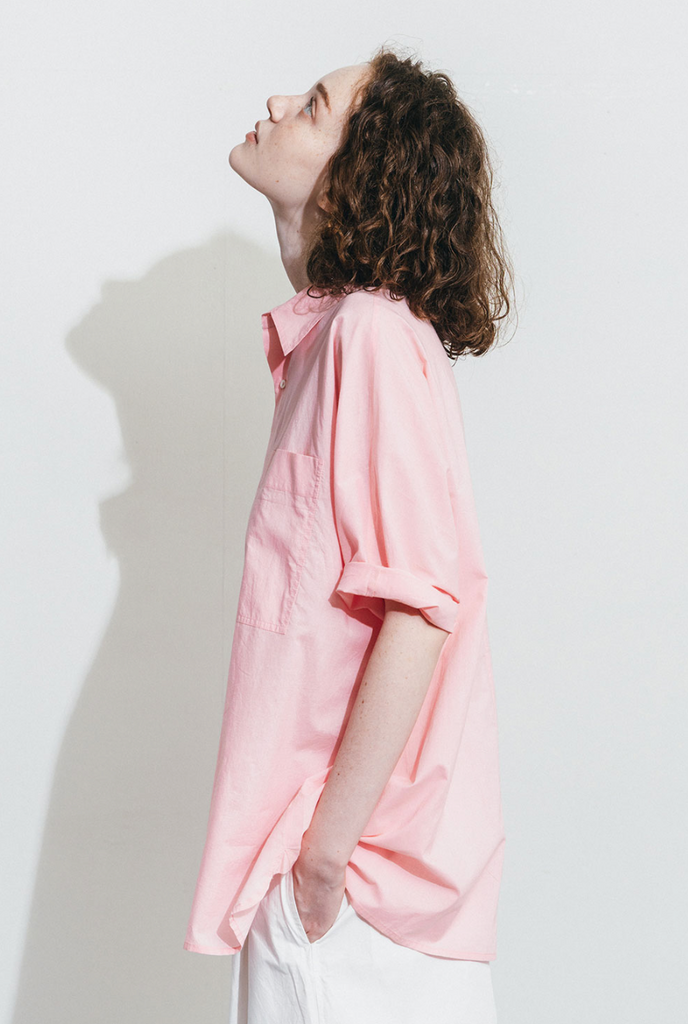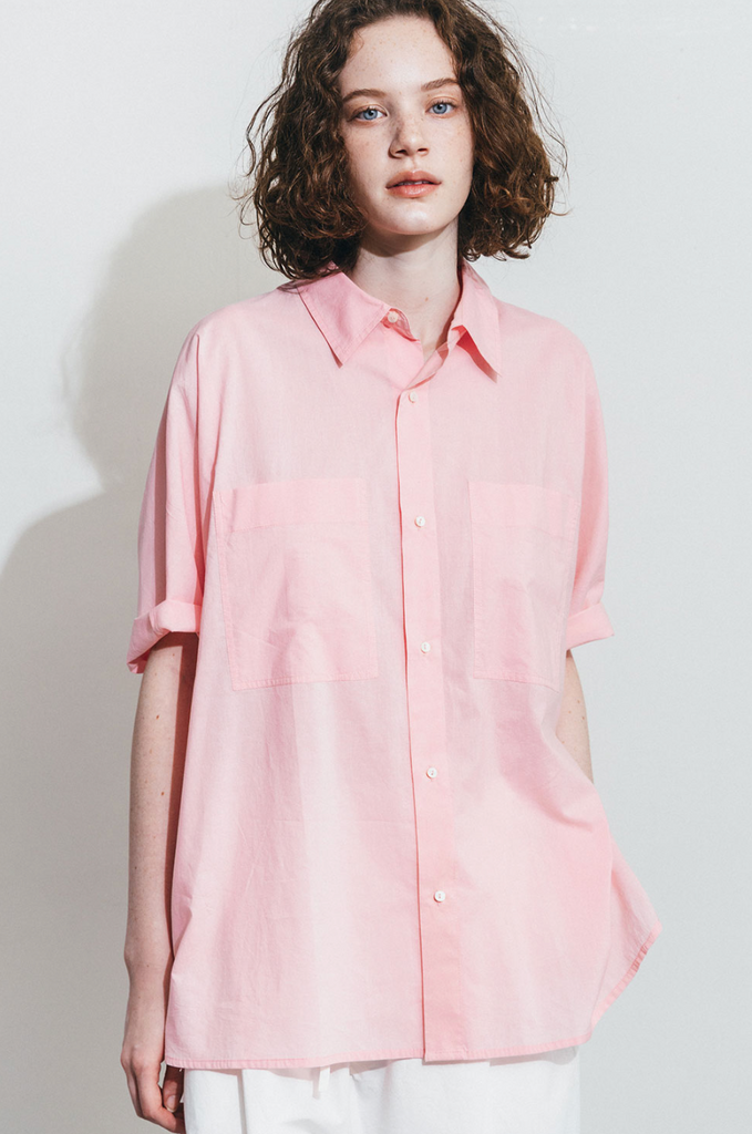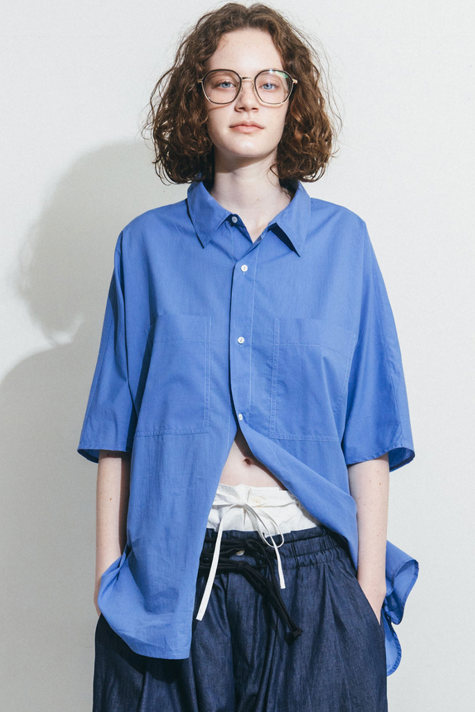 A versatile oversized shirt with a simple yet refined design. The hip-covering length and a collar offer a mannish appeal, softened by the drapey cotton fabric and dolman sleeves. A rounded hem ensures effortless styling with basic bottoms. The large chest patch pocket adds a casual accent. Wear it open for a relaxed layering look.