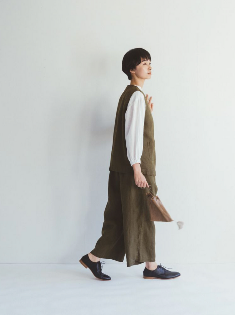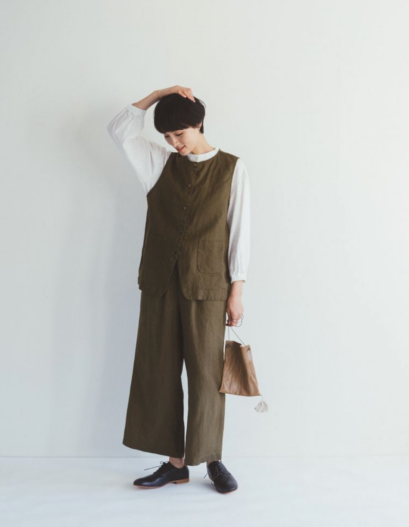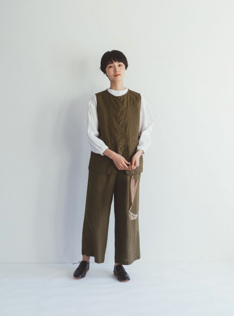 Simply adding this gilet to a dress or shirt instantly creates a fresh, stylish balance. It has a slightly long length that covers the hips, patch pockets on the front, and a curved hemline for a playful, casual look. It can be worn open or buttoned, and the loose fit around the body and armholes makes it suitable for pairing with oversized knits or shirts. A versatile item that works in any season.